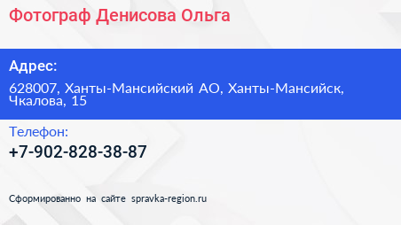 Фотограф Денисова Ольга по адресу 628007, Ханты-Мансийский АО, Ханты-Мансийск, Чкалова, 15 в дальнейшем Организация, размещена в следующих категориях: