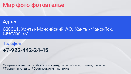 Мир фото, фотоателье по адресу 628011, Ханты-Мансийский АО, Ханты-Мансийск, Светлая, 67 в дальнейшем Организация, размещена в следующих категориях: