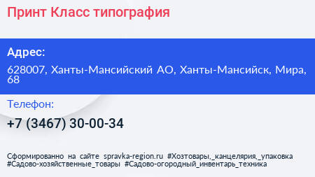 Принт-Класс, типография по адресу 628007, Ханты-Мансийский АО, Ханты-Мансийск, Мира, 68 в дальнейшем Организация, размещена в следующих категориях: