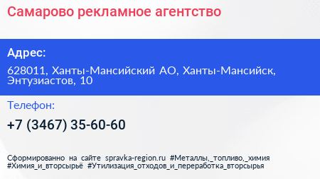 Самарово, рекламное агентство по адресу 628011, Ханты-Мансийский АО, Ханты-Мансийск, Энтузиастов, 10 в дальнейшем Организация, размещена в следующих категориях: