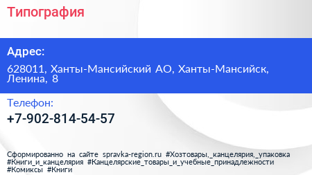Типография по адресу 628011, Ханты-Мансийский АО, Ханты-Мансийск, Ленина, 8 в дальнейшем Организация, размещена в следующих категориях:
