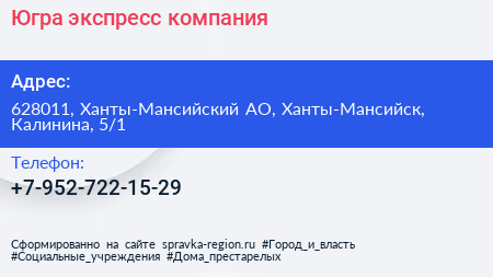 Югра экспресс, компания по адресу 628011, Ханты-Мансийский АО, Ханты-Мансийск, Калинина, 5/1 в дальнейшем Организация, размещена в следующих категориях:
