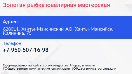Золотая рыбка, ювелирная мастерская по адресу 628011, Ханты-Мансийский АО, Ханты-Мансийск, Калинина, 75 в дальнейшем Организация, размещена в следующих категориях: