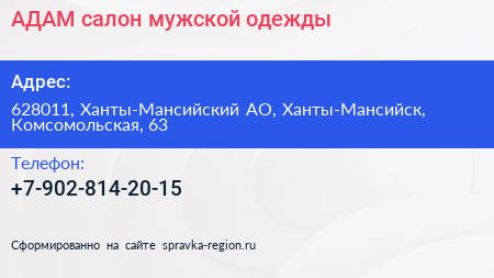 АДАМ, салон мужской одежды по адресу 628011, Ханты-Мансийский АО, Ханты-Мансийск, Комсомольская, 63 в дальнейшем Организация, размещена в следующих категориях: