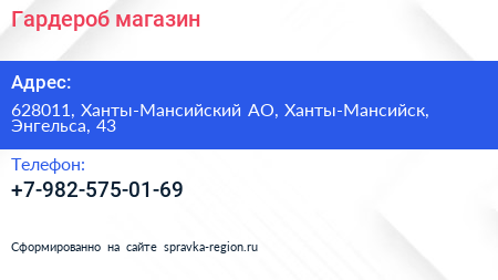Гардероб, магазин по адресу 628011, Ханты-Мансийский АО, Ханты-Мансийск, Энгельса, 43 в дальнейшем Организация, размещена в следующих категориях: