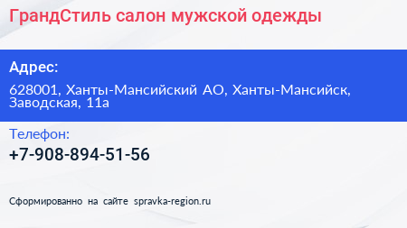 ГрандСтиль, салон мужской одежды по адресу 628001, Ханты-Мансийский АО, Ханты-Мансийск, Заводская, 11а в дальнейшем Организация, размещена в следующих категориях: