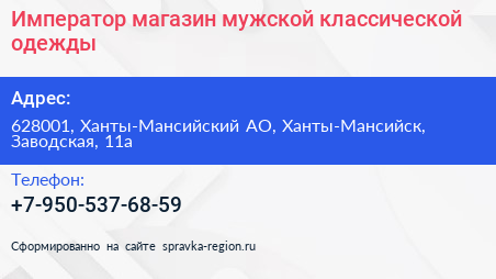 Император, магазин мужской классической одежды по адресу 628001, Ханты-Мансийский АО, Ханты-Мансийск, Заводская, 11а в дальнейшем Организация, размещена в следующих категориях: