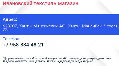 Ивановский текстиль, магазин по адресу 628007, Ханты-Мансийский АО, Ханты-Мансийск, Чехова, 72а в дальнейшем Организация, размещена в следующих категориях: