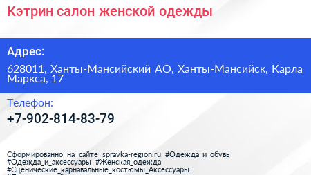 Кэтрин, салон женской одежды по адресу 628011, Ханты-Мансийский АО, Ханты-Мансийск, Карла Маркса, 17 в дальнейшем Организация, размещена в следующих категориях: