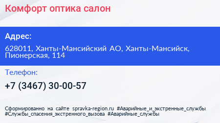 Комфорт-оптика, салон по адресу 628011, Ханты-Мансийский АО, Ханты-Мансийск, Пионерская, 114 в дальнейшем Организация, размещена в следующих категориях: