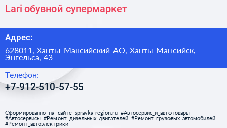 Lari, обувной супермаркет по адресу 628011, Ханты-Мансийский АО, Ханты-Мансийск, Энгельса, 43 в дальнейшем Организация, размещена в следующих категориях: