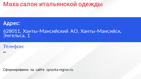 Maxa, салон итальянской одежды по адресу 628011, Ханты-Мансийский АО, Ханты-Мансийск, Энгельса, 1 в дальнейшем Организация, размещена в следующих категориях:
