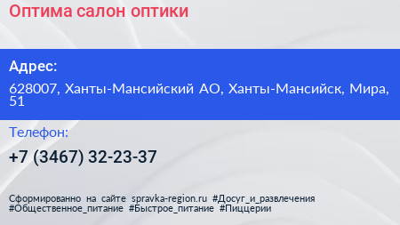 Оптима, салон оптики по адресу 628007, Ханты-Мансийский АО, Ханты-Мансийск, Мира, 51 в дальнейшем Организация, размещена в следующих категориях: