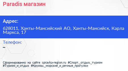 Paradis, магазин по адресу 628011, Ханты-Мансийский АО, Ханты-Мансийск, Карла Маркса, 17 в дальнейшем Организация, размещена в следующих категориях:
