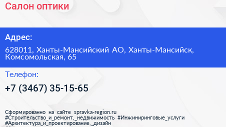 Салон оптики по адресу 628011, Ханты-Мансийский АО, Ханты-Мансийск, Комсомольская, 65 в дальнейшем Организация, размещена в следующих категориях: