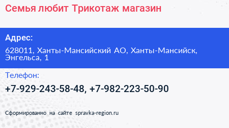 Семья любит Трикотаж, магазин по адресу 628011, Ханты-Мансийский АО, Ханты-Мансийск, Энгельса, 1 в дальнейшем Организация, размещена в следующих категориях: