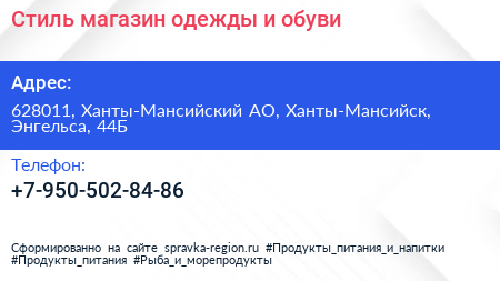 Стиль, магазин одежды и обуви по адресу 628011, Ханты-Мансийский АО, Ханты-Мансийск, Энгельса, 44Б в дальнейшем Организация, размещена в следующих категориях: