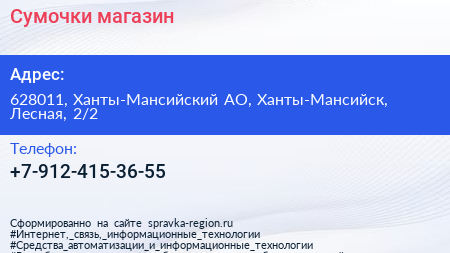 Сумочки, магазин по адресу 628011, Ханты-Мансийский АО, Ханты-Мансийск, Лесная, 2/2 в дальнейшем Организация, размещена в следующих категориях: