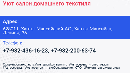 Уют, салон домашнего текстиля по адресу 628011, Ханты-Мансийский АО, Ханты-Мансийск, Ленина, 36 в дальнейшем Организация, размещена в следующих категориях: