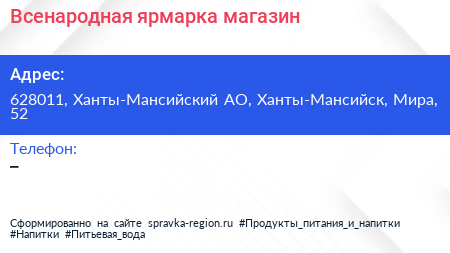 Всенародная ярмарка, магазин по адресу 628011, Ханты-Мансийский АО, Ханты-Мансийск, Мира, 52 в дальнейшем Организация, размещена в следующих категориях: