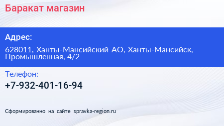 Баракат, магазин по адресу 628011, Ханты-Мансийский АО, Ханты-Мансийск, Промышленная, 4/2 в дальнейшем Организация, размещена в следующих категориях: