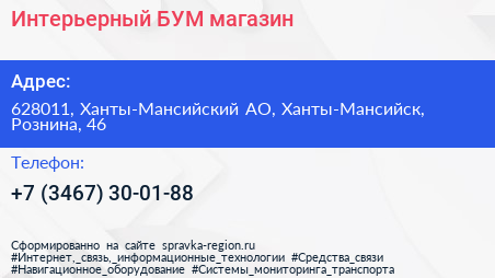 Интерьерный БУМ, магазин по адресу 628011, Ханты-Мансийский АО, Ханты-Мансийск, Рознина, 46 в дальнейшем Организация, размещена в следующих категориях: