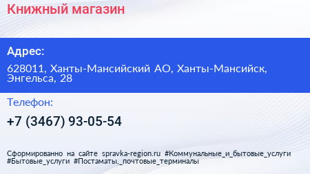 Книжный магазин по адресу 628011, Ханты-Мансийский АО, Ханты-Мансийск, Энгельса, 28 в дальнейшем Организация, размещена в следующих категориях: