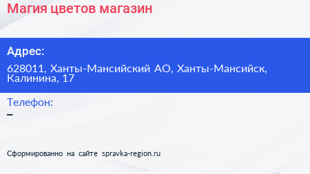 Магия цветов, магазин по адресу 628011, Ханты-Мансийский АО, Ханты-Мансийск, Калинина, 17 в дальнейшем Организация, размещена в следующих категориях: