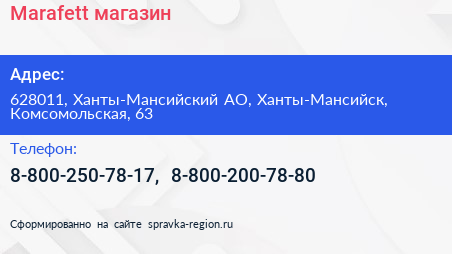 Marafett, магазин по адресу 628011, Ханты-Мансийский АО, Ханты-Мансийск, Комсомольская, 63 в дальнейшем Организация, размещена в следующих категориях: