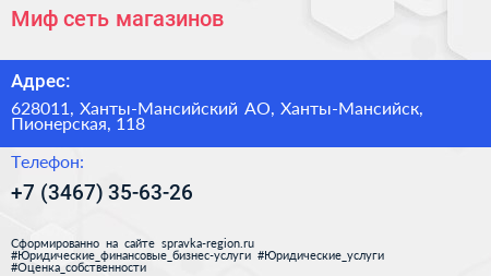 Миф, сеть магазинов по адресу 628011, Ханты-Мансийский АО, Ханты-Мансийск, Пионерская, 118 в дальнейшем Организация, размещена в следующих категориях: