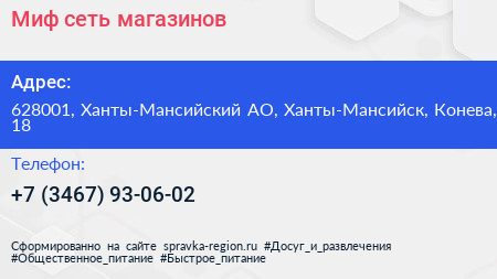 Миф, сеть магазинов по адресу 628001, Ханты-Мансийский АО, Ханты-Мансийск, Конева, 18 в дальнейшем Организация, размещена в следующих категориях: