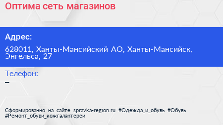 Оптима, сеть магазинов по адресу 628011, Ханты-Мансийский АО, Ханты-Мансийск, Энгельса, 27 в дальнейшем Организация, размещена в следующих категориях: