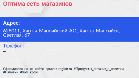 Оптима, сеть магазинов по адресу 628011, Ханты-Мансийский АО, Ханты-Мансийск, Светлая, 67 в дальнейшем Организация, размещена в следующих категориях: