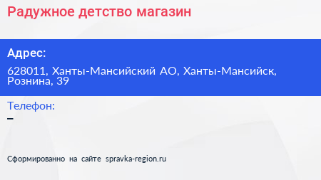 Радужное детство, магазин по адресу 628011, Ханты-Мансийский АО, Ханты-Мансийск, Рознина, 39 в дальнейшем Организация, размещена в следующих категориях: