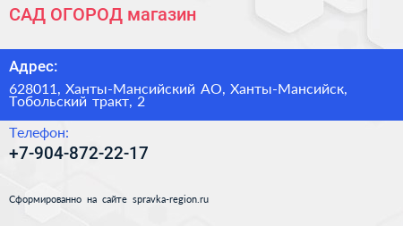 САД ОГОРОД, магазин по адресу 628011, Ханты-Мансийский АО, Ханты-Мансийск, Тобольский тракт, 2 в дальнейшем Организация, размещена в следующих категориях: