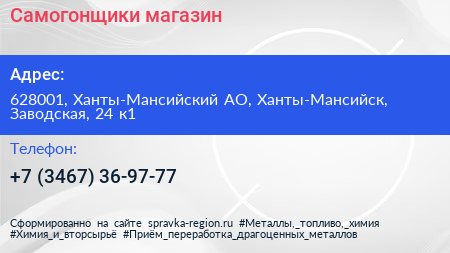 Самогонщики, магазин по адресу 628001, Ханты-Мансийский АО, Ханты-Мансийск, Заводская, 24 к1 в дальнейшем Организация, размещена в следующих категориях: