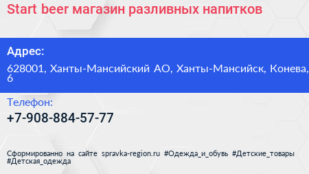 Start beer, магазин разливных напитков по адресу 628001, Ханты-Мансийский АО, Ханты-Мансийск, Конева, 6 в дальнейшем Организация, размещена в следующих категориях: