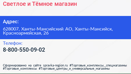 Светлое и Тёмное, магазин по адресу 628007, Ханты-Мансийский АО, Ханты-Мансийск, Красноармейская, 26 в дальнейшем Организация, размещена в следующих категориях: