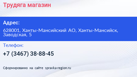 Трудяга, магазин по адресу 628001, Ханты-Мансийский АО, Ханты-Мансийск, Заводская, 5 в дальнейшем Организация, размещена в следующих категориях: