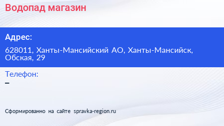 Водопад, магазин по адресу 628011, Ханты-Мансийский АО, Ханты-Мансийск, Обская, 29 в дальнейшем Организация, размещена в следующих категориях: