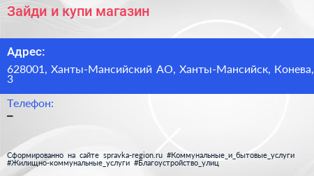 Зайди и купи, магазин по адресу 628001, Ханты-Мансийский АО, Ханты-Мансийск, Конева, 3 в дальнейшем Организация, размещена в следующих категориях:
