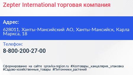 Zepter International, торговая компания по адресу 628011, Ханты-Мансийский АО, Ханты-Мансийск, Карла Маркса, 18 в дальнейшем Организация, размещена в следующих категориях: