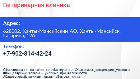 Ветеринарная клиника по адресу 628002, Ханты-Мансийский АО, Ханты-Мансийск, Гагарина, 126 в дальнейшем Организация, размещена в следующих категориях: