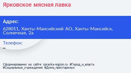 Ярковское, мясная лавка по адресу 628011, Ханты-Мансийский АО, Ханты-Мансийск, Солнечная, 2а в дальнейшем Организация, размещена в следующих категориях: