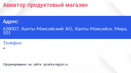 Авиатор, продуктовый магазин по адресу 628007, Ханты-Мансийский АО, Ханты-Мансийск, Мира, 101 в дальнейшем Организация, размещена в следующих категориях: