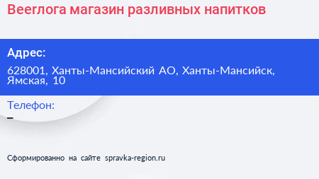 Beerлога, магазин разливных напитков по адресу 628001, Ханты-Мансийский АО, Ханты-Мансийск, Ямская, 10 в дальнейшем Организация, размещена в следующих категориях:
