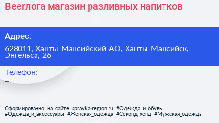 Beerлога, магазин разливных напитков по адресу 628011, Ханты-Мансийский АО, Ханты-Мансийск, Энгельса, 26 в дальнейшем Организация, размещена в следующих категориях: