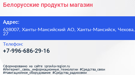 Белорусские продукты, магазин по адресу 628007, Ханты-Мансийский АО, Ханты-Мансийск, Чехова, 27 в дальнейшем Организация, размещена в следующих категориях: