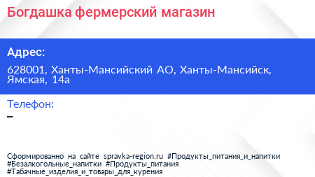 Богдашка, фермерский магазин по адресу 628001, Ханты-Мансийский АО, Ханты-Мансийск, Ямская, 14а в дальнейшем Организация, размещена в следующих категориях: