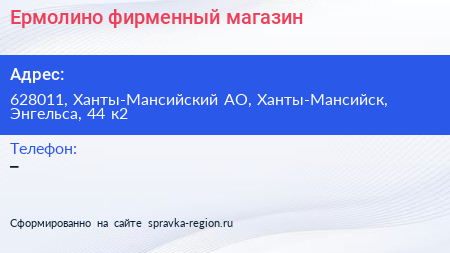 Ермолино, фирменный магазин по адресу 628011, Ханты-Мансийский АО, Ханты-Мансийск, Энгельса, 44 к2 в дальнейшем Организация, размещена в следующих категориях: